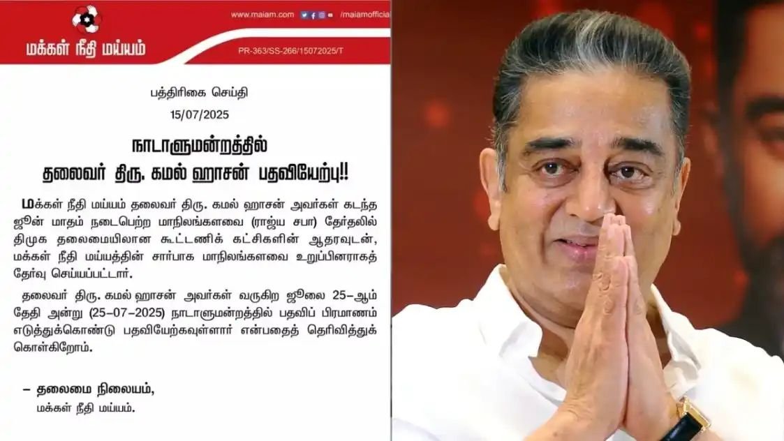 மக்கள் நீதி மய்யம் தலைவர் கமல்ஹாசன் அவர்கள், ராஜ்யசபா உறுப்பினராக மாநிலங்களவை எம்பியாக பதவியேற்க இருக்கிறார். அவர் ஜூலை 25ஆம் தேதி நாடாளுமன்றத்தில் பதவிப் பிரமாணம் செய்து கொள்கிறார் என்று மநீம் அதிகாரப்பூர்வமாக அறிவித்துள்ளது.