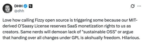 A more accurate framing would be that Fizzy is source available. You can read it, run it, and modify it. But DHH’s company is keeping the